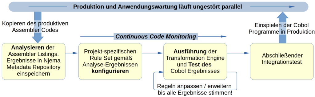 • ermöglicht es, innerhalb von wenigen Stunden eine vollständige Transformation und den finalen Integrationstest durchzuführen, bevor die Anwendung als Cobol-Inkarnation in Produktion gehen kann.